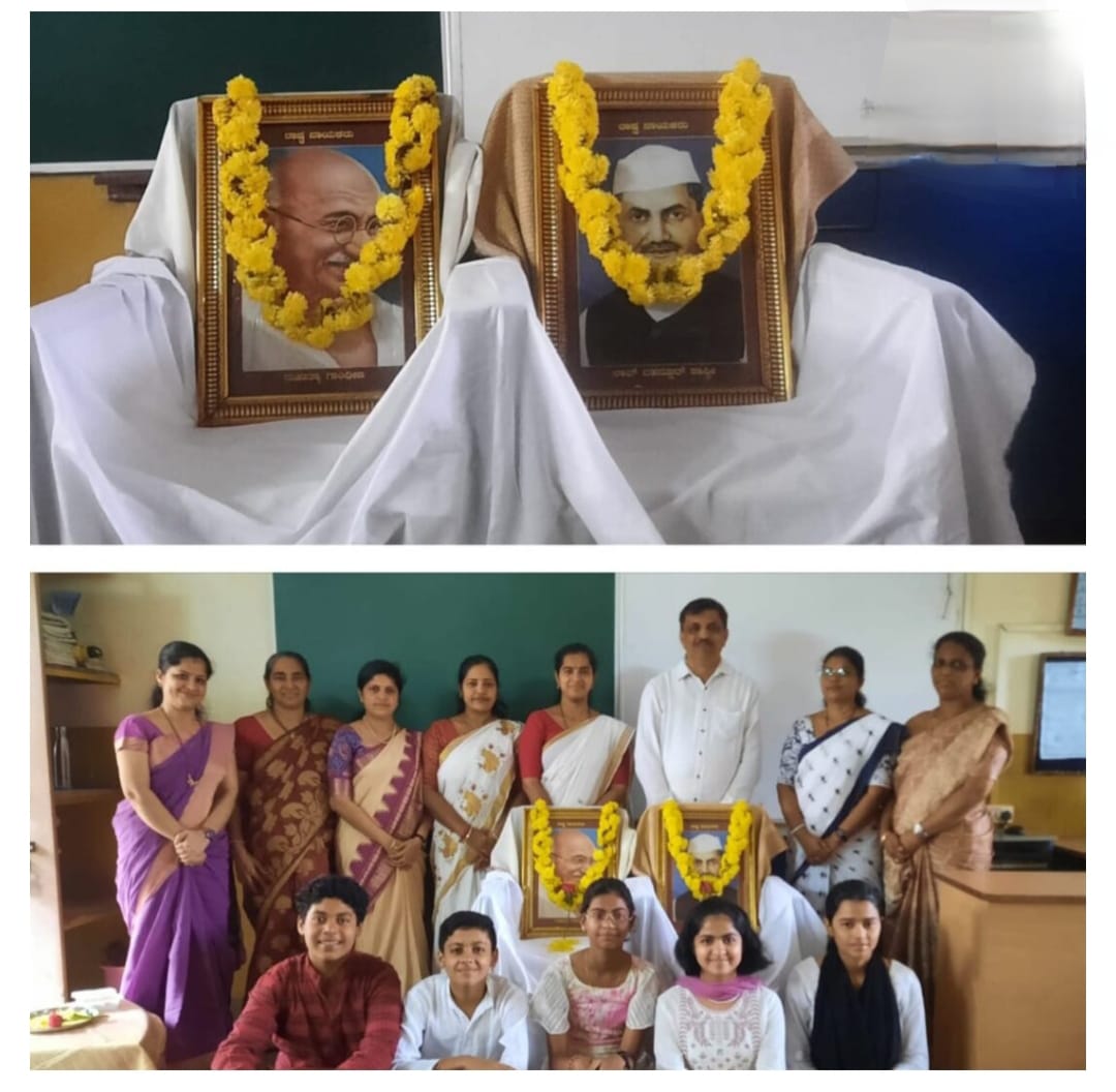Ujire 2 October 2025: School observed Gandhi Jayanthi and Lal Bahadur Shastri Jayanthi with reverence on October 2, 2025, at the school campus. The programme witnessed the presence of the Principal, staff, and students who actively took part in paying tribute to the two great leaders of the nation. The portraits of Mahatma Gandhi and